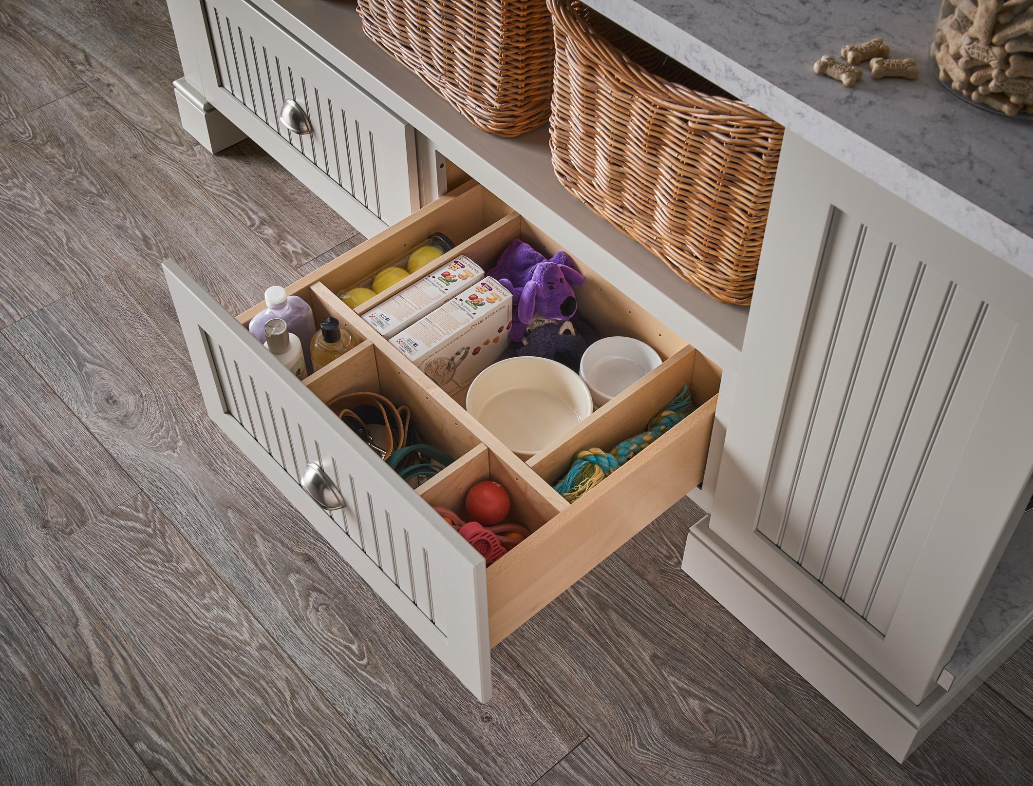 Adjustable dividers allow you to personalize your storage. Here, pet supplies are conveniently housed all together, but do not slide or shift around in the drawer.