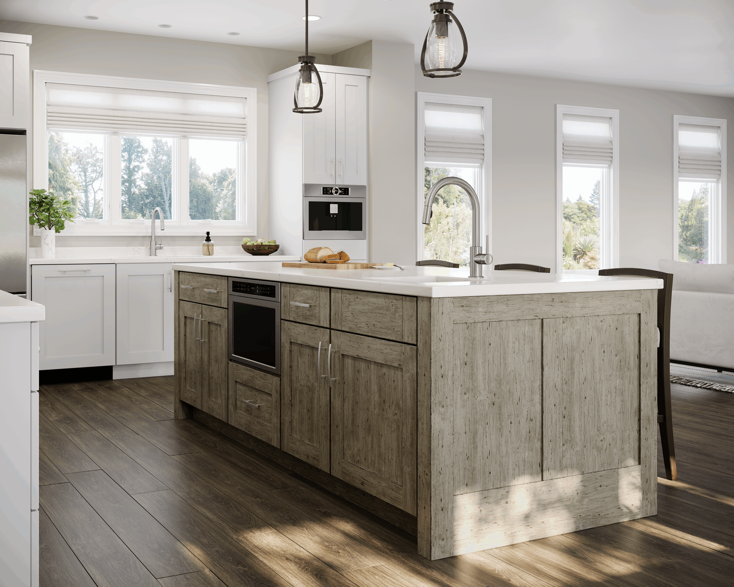 Holbrook Maple Sea Salt Classic on perimeter cabinets. Holbrook Maple Silver Appaloosa on the island; and Sorrento Maple Silver Appaloosa on the hutch.