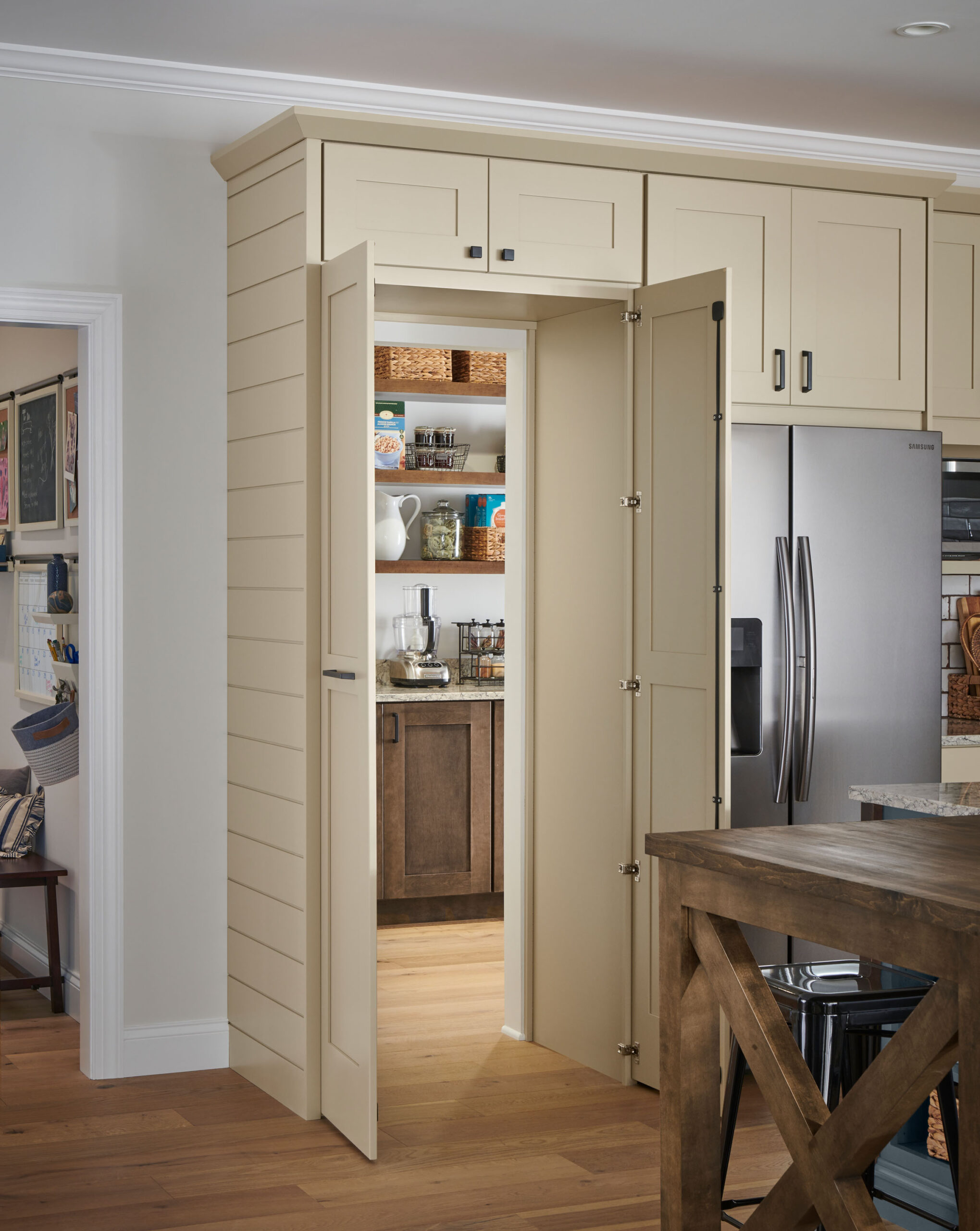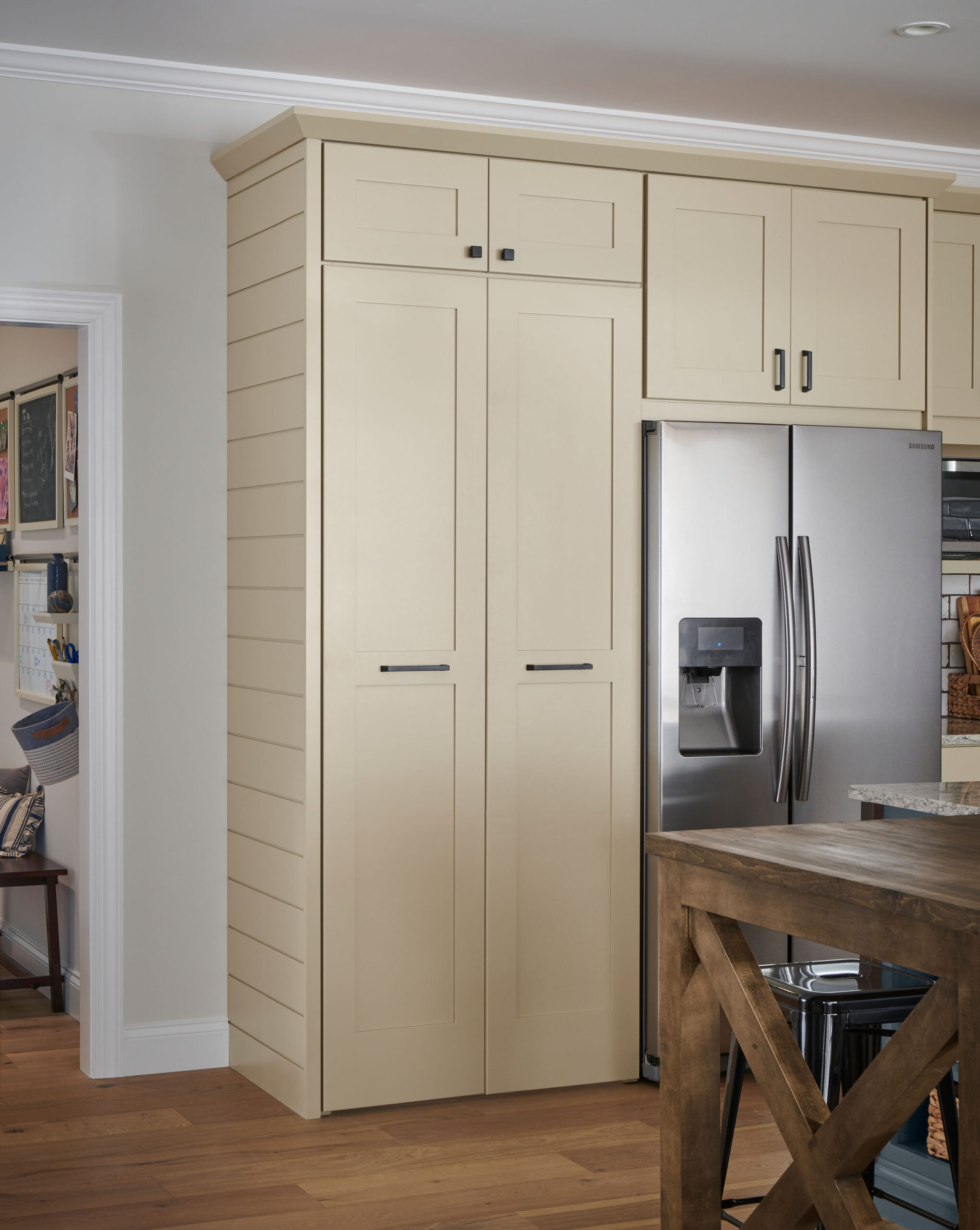 The new Walk-In Pantry cabinet conceals an entire closet behind coordinating full-height doors for a seamless look.