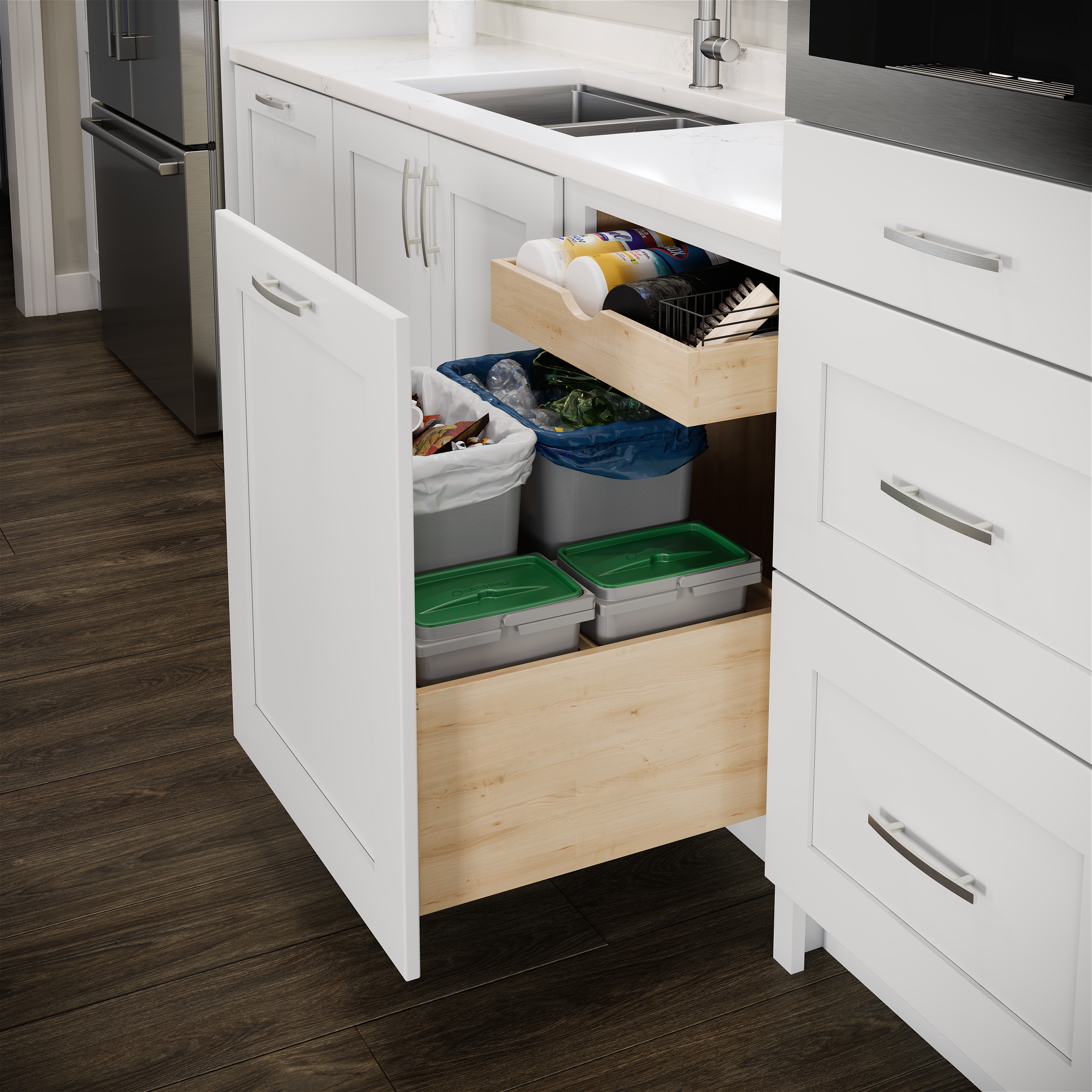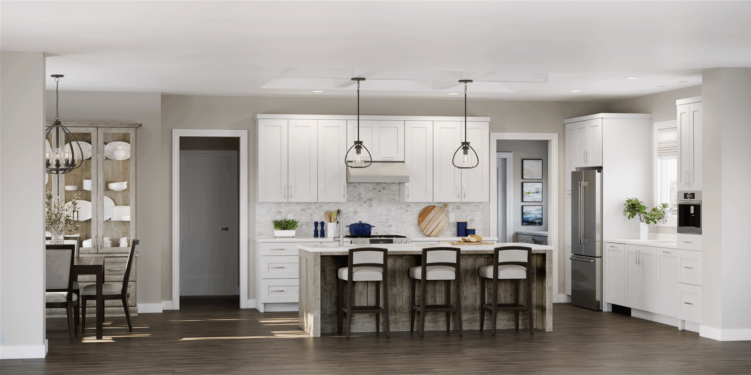 Holbrook Maple Sea Salt Classic on perimeter cabinets. Holbrook Maple Silver Appaloosa on the island; and Sorrento Maple Silver Appaloosa on the hutch.