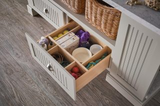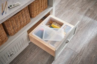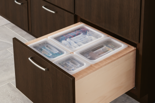 Adjustable dividers allow you to personalize your storage. Here, pet supplies are conveniently housed all together, but do not slide or shift around in the drawer.