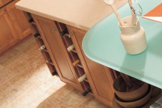 Handy base cabinet glides out to reveal a central location for spices, sauces, and other small dry-goods items.