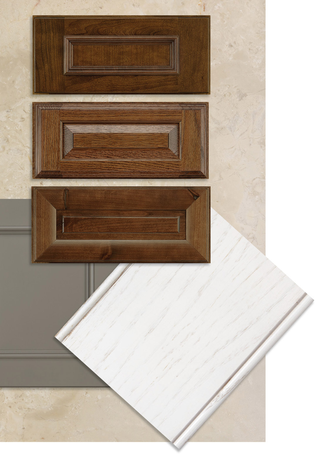 Soft, dimensional Peppercorn or Castle Rock Dry Brush lend subtle texture to French Roast, while warm white Irish Créme is a classically refined pairing. Door shown in Knotty Alder French Roast Sable Glaze and Highlight, with French Roast finish chips in Oak, Rustic Maple and Hickory.